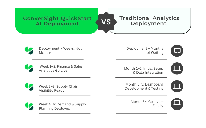 Don’t let reporting delays, forecasting errors, and fragmented analytics slow your growth. Give your teams a solution that works as fast as they do. QuickStart AI, get a true decision intelligence solution built to help your teams act faster, forecast better, and plan smarter with ConverSight’s QuickStart AI for ERP and Supply Chains.
