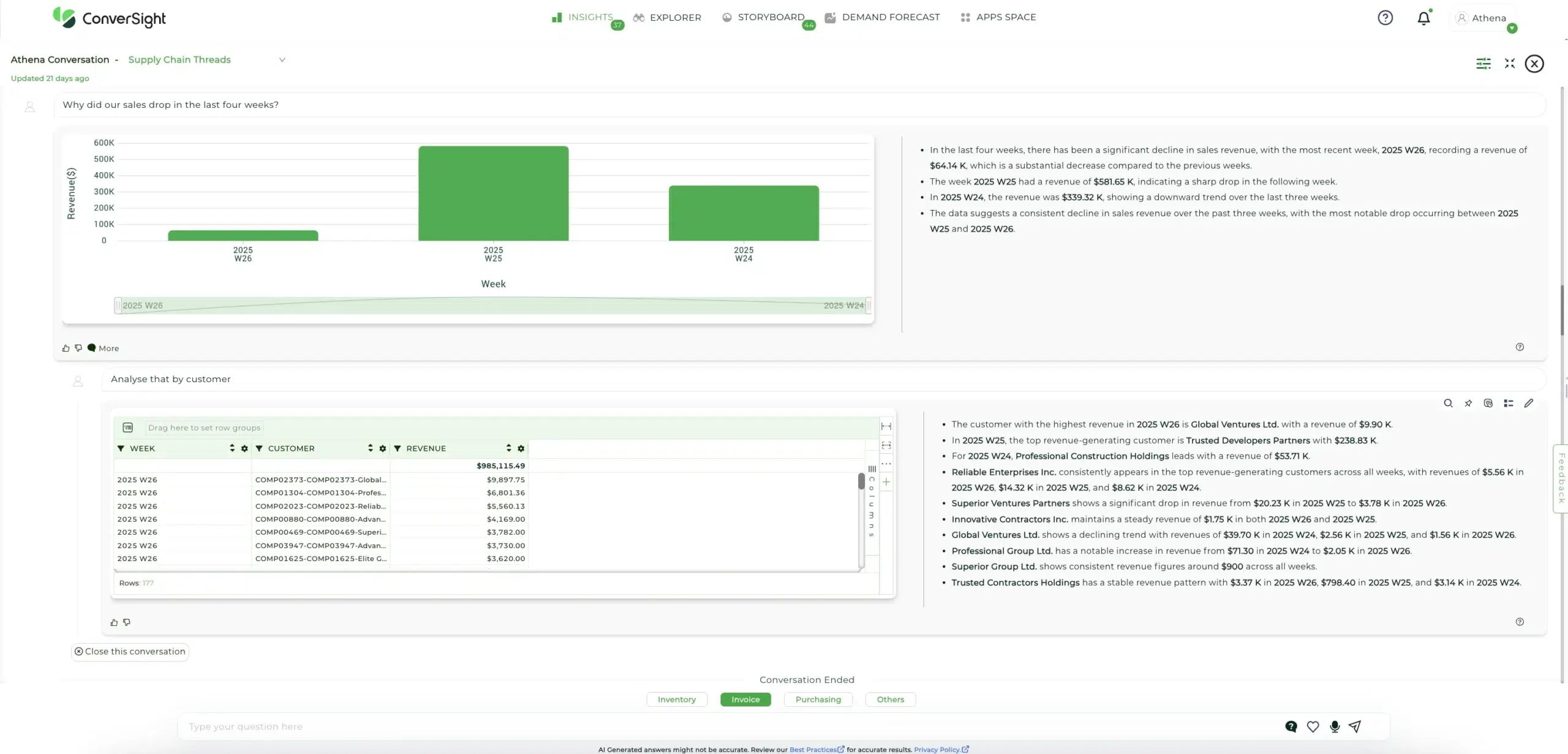 ConverSight’s contextual insights are tailored to each user’s role and operational focus. Whether it’s a production planner tracking output, a procurement manager optimizing supplier performance, or a quality engineer monitoring defect trends, Athena personalizes information delivery based on what truly matters to the user. This ensures that decision-making is not only data-driven but also context-aware — bridging the gap between analytics and execution.