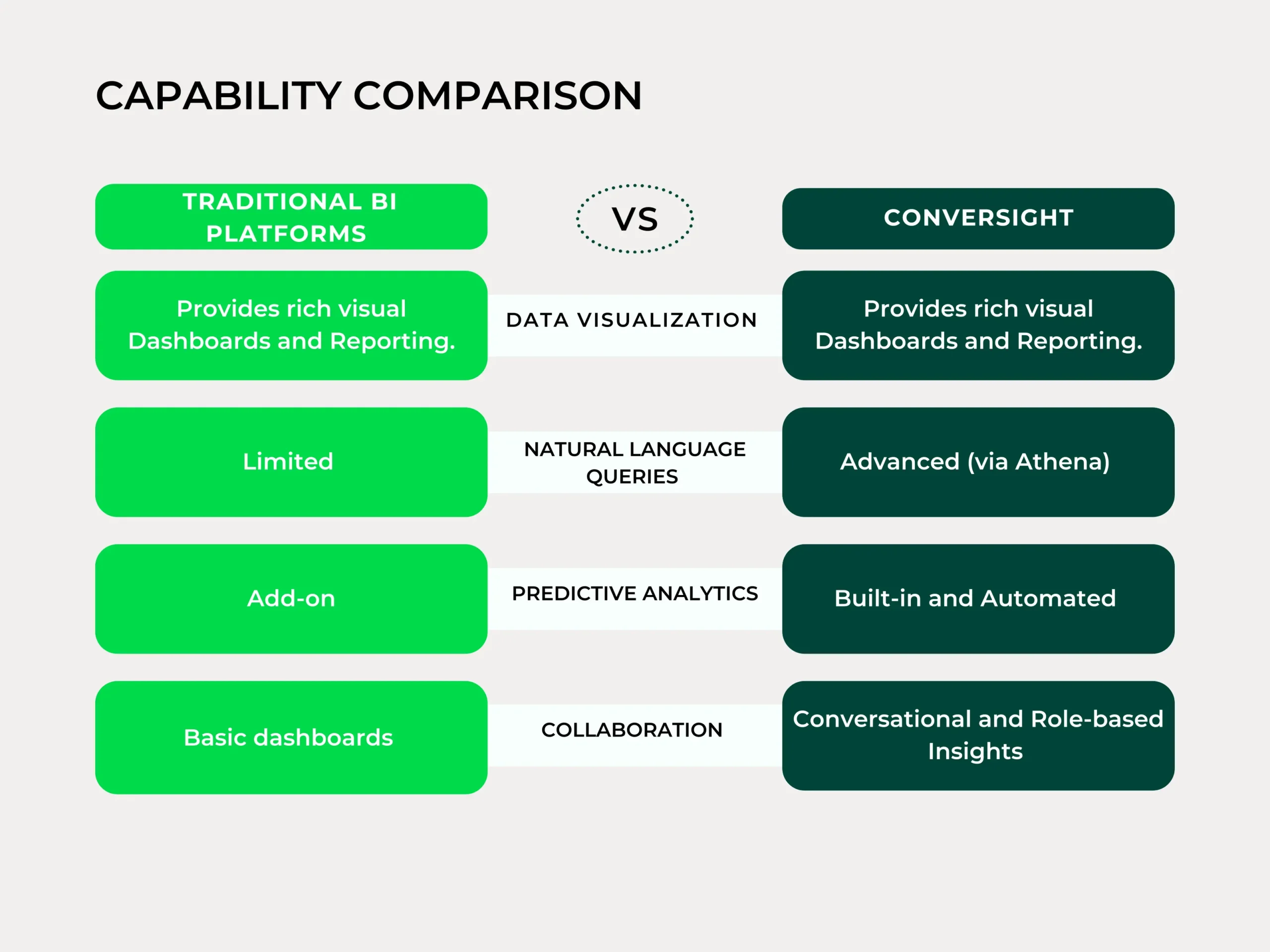 Unlike traditional BI tools that depend on static dashboards or limited predictive modules, ConverSight delivers a unified Decision Intelligence framework — integrating conversational AI, predictive modeling, and prescriptive recommendations in one seamless environment. This makes it especially powerful for the automotive sector, where the pace of operations and complexity of data demand constant, proactive responses.