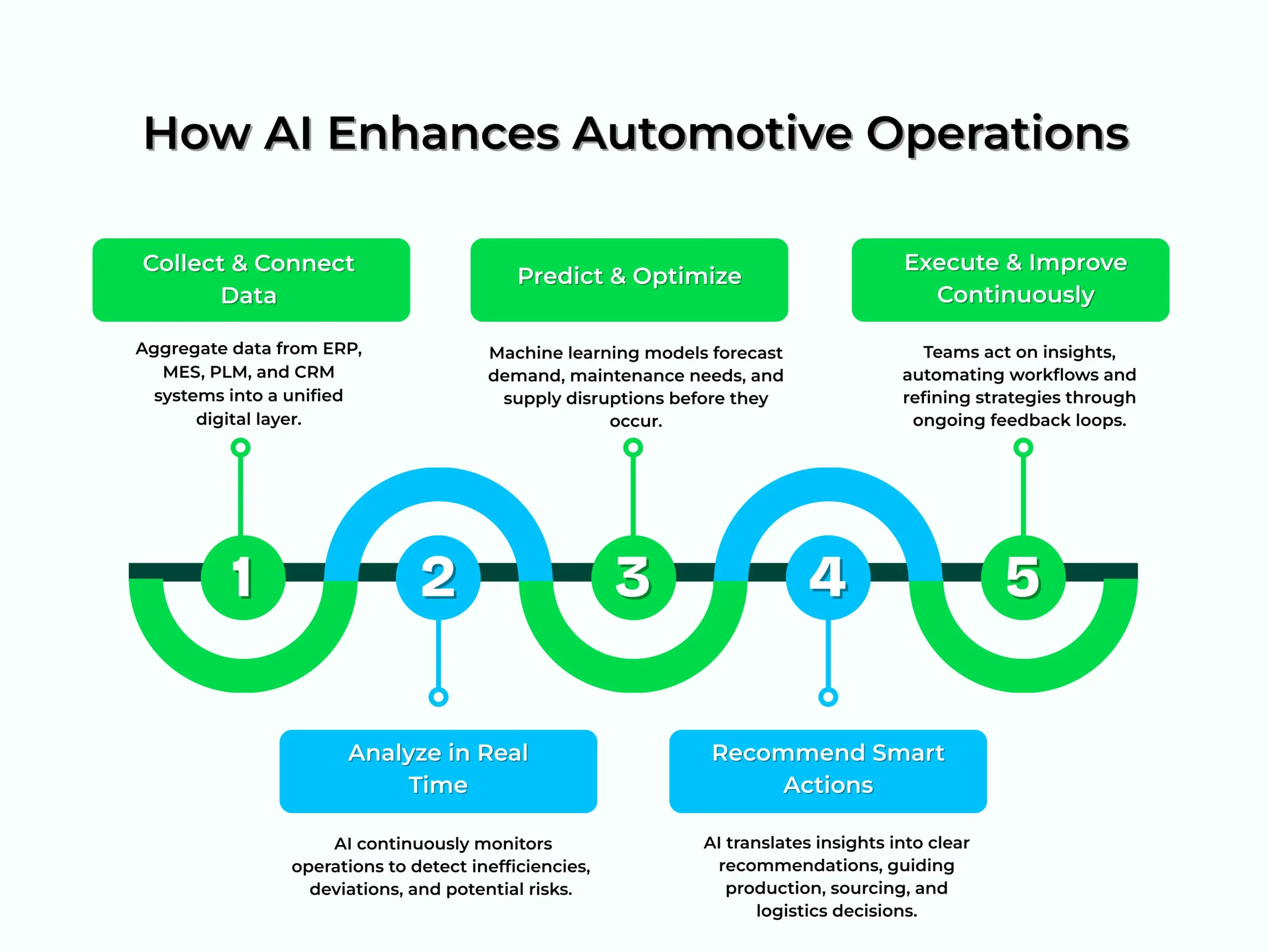 This is where AI analytics transforms from a tool to a game-changer. Modern AI for automotive companies integrates data streams across all enterprise systems, creating a single, dynamic layer of intelligence that spans departments and functions. Instead of manually gathering and interpreting information, teams can rely on AI to continuously analyze data, detect anomalies, and predict potential issues before they occur.