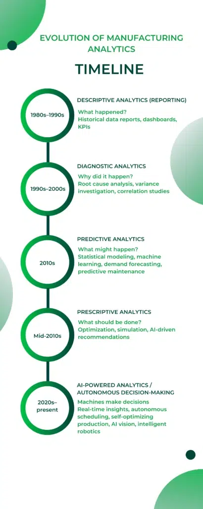 Analytics has always been part of manufacturing, but AI has transformed it into a strategic asset. The evolution of manufacturing analytics highlights just how far the industry has come: