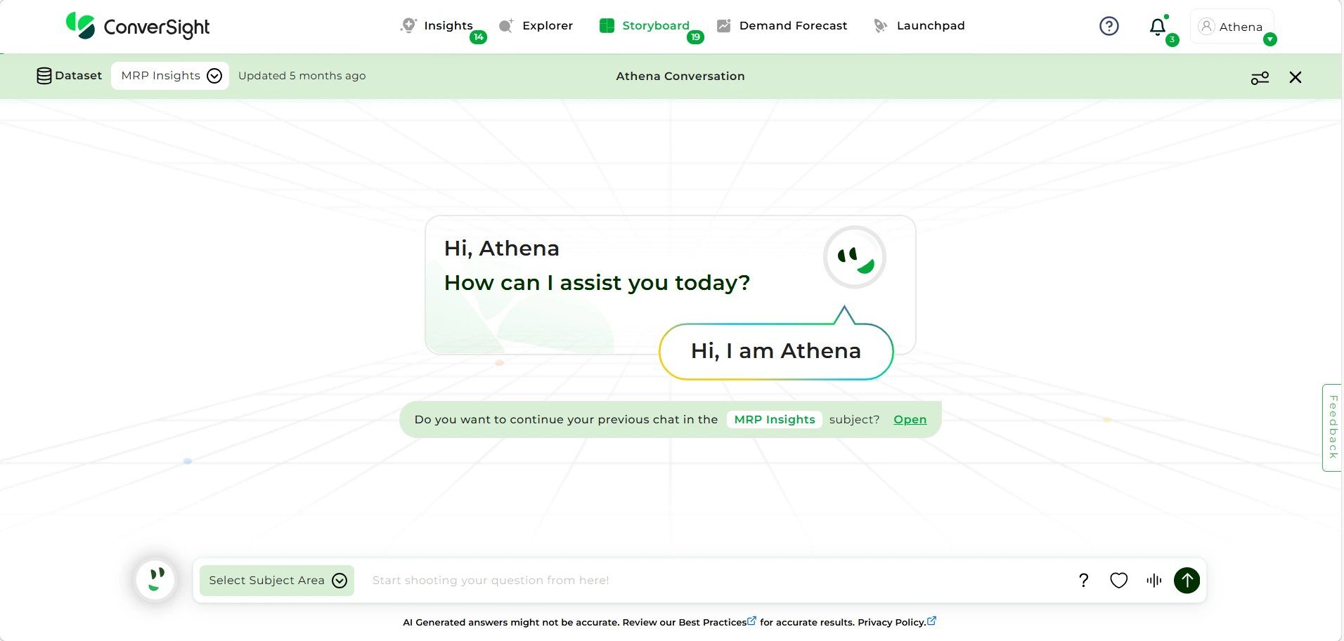 At the core of the ConverSight platform is Athena, an AI agent that continuously monitors, analyzes, and interprets business data.